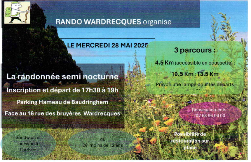 Mercredi 28 mai, randonnée club semi-nocturne à Wardrecques. parcours de 10.5 ou 13.5 kms. Départ 18h parking du Hameau de Baudringhem face au 16 rue des Bruyères ou pour le covoiturage 17h40 au week-end. En cas de temps couvert, prévoir une lampe. L'inscription de de 4 euros