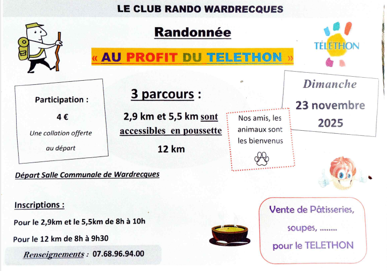 Pour dimanche 23 novembre 2025, randonnée à Wardrecques au profit du Téléthon 2025. Parcours de 3, 6 ou 12 kms. Départ 9 h salle communale ou pour le covoiturage, 8h40 au parking du week-end. La participation est de 4 euros par personne.