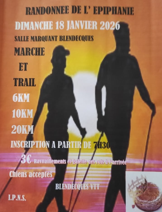 Dimanche 18 janvier 2026, randonnée de l'Epiphanie à Blendecques. Parcours de 6, 10 ou 20 kms. Départ 9 h Salle Marquant ou pour le covoiturage à 8h40 au week-end. L'inscription de 3 euros sera prise en charge par l'association